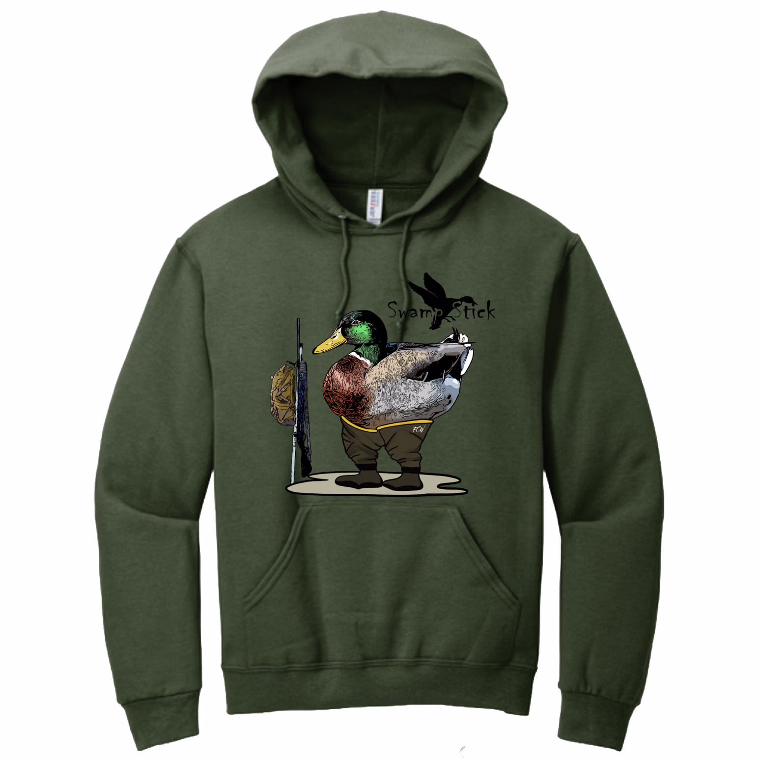 Soft, field-ready comfort that carries the Swamp Stick Puddle Duck logo from the marsh to main street. Spread the love of the swamp as you wave to your neighbor, hang at the campsite, or just with the gang deep in the marsh waiting while the ducks work the decoys. Brought to you in Hunters Green featuring our Puddle Duck Mascot wearing waders.